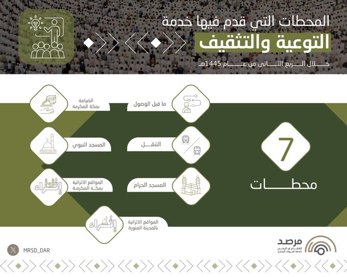 تم تقديم خدمة التوعية والتثقيف في 7 محطات خلال مراحل رحلة الضيف ( ما قبل الوصول - التنقل - المسجد الحرام - المسجد النبوي - الضيافة بمكة المكرمة - المواقع الاثرائية بالمدينة المنورة - المواقع الاثرائية بمكة المكرمة)