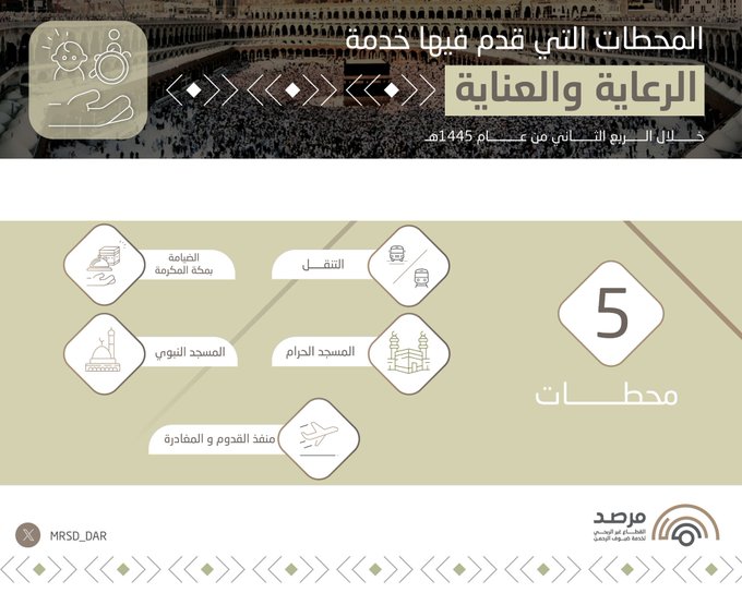 تم تقديم خدمة الرعاية والعناية في 5 محطات خلال مراحل رحلة الضيف (منفذ القدوم والمغادرة - التنقل - المسجد الحرام - المسجد النبوي - الضيافة بمكة المكرمة )