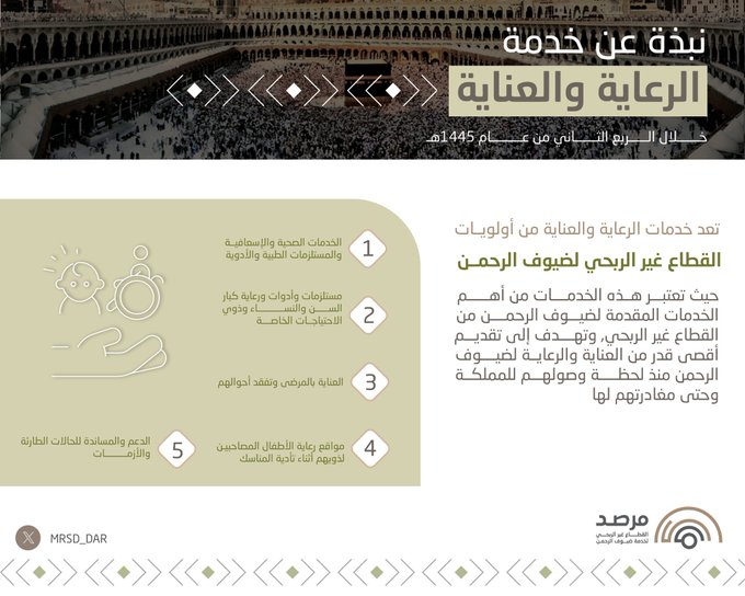خدمات الرعاية والعناية لضيوف الرحمن تأتي في مقدمة أولوياتنا، لتوفير تجربة آمنة وصحية، عبر تقديم الرعاية الطبية، وتوفير المستلزمات اللازمة، ودعم احتياجاتهم بكل عناية واهتمام.