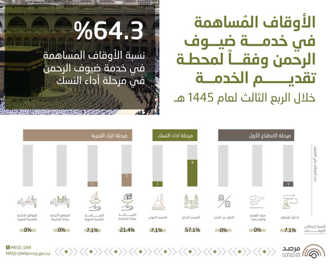 شكلت نسبة الأوقاف المساهمة في خدمة ضيوف الرحمن في مرحلة النسك أكثر من النصف بواقع 64.3%.