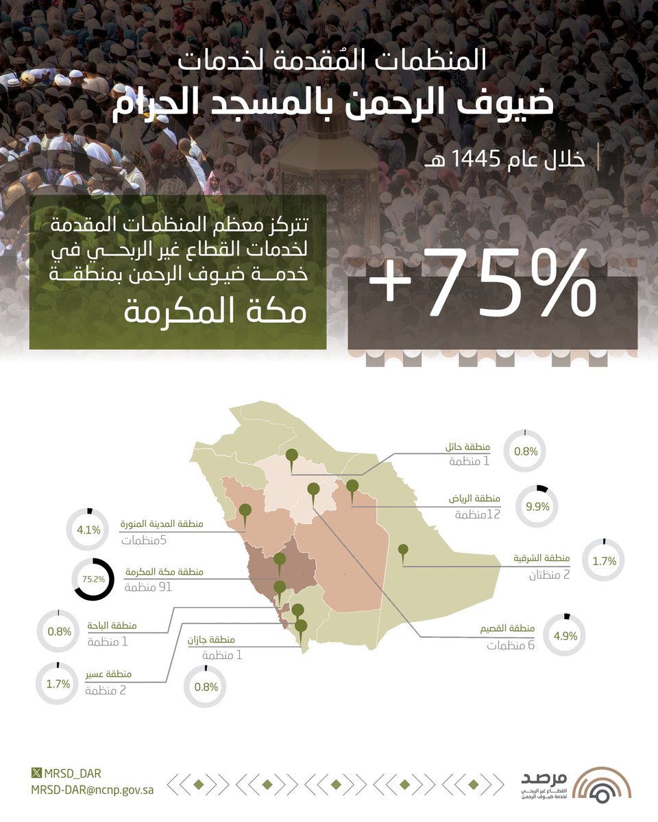 تركزت معظم منظمات القطاع غير الربحي المُساهمة في خدمة ضيوف الرحمن في منطقة مكة المكرمة بنسبة 75% من إجمالي عدد المنظمات المُساهمة