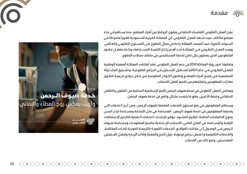 يعكس العمل التطوعي في خدمة ضيوف الرحمن القيم الإسلامية السامية من التعاون والتكافل الاجتماعي وخدمة الآخرين، وهو ما يتجسد بشكل واضح في خدمة ضيوف الرحمن، يستعرض تقرير التطوع في خدمة ضيوف الرحمن التطوع جهود المملكة في التطوع وتطور أعداد المتطوعين ومن ثم مجالات ومستويات التطوع ومستهدفات التطوع وحوكمة التطوع على التطوع في خدمة ضيوف الرحمن مبينا أهمية التطوع في خدمة ضيوف الرحمن ومستهدفاته، ويتضمن التقري نماذج من جهود المنظمات المختلفة للتطوع في خدمة ضيوف الرحمن، بالإضافة إلى أبرز التحديات والمقترحات المستخلصة من منظمات القطاع غير الربحي.